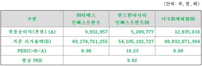 회사의 주당 평가가액은 2021년 순이익에 유사회사의 평균 PER배수를 적용하여 회사가치를 정하고, 주식수로 나누어 산출된 값과, 2022년 3분기말 순익익을 연간 환산한 후 유사회사의 평균 PER배수를 적용하여 회사 가치를 정하고 주식 수로 나누어 산출된 값의 편균치입니다.