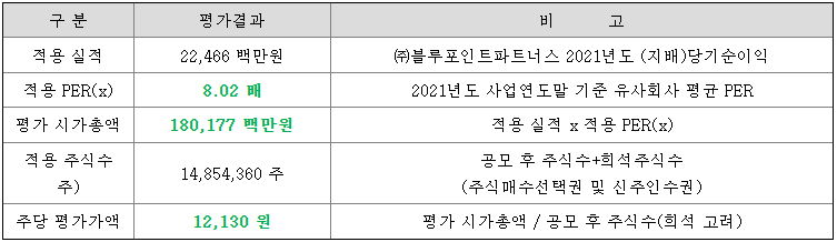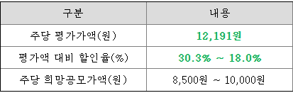 블루포인트파트너스의 희망 공모가격은 회사의 주당 평가가액 12,191원에서 18.0% ~ 30.3% 할인한 가격입니다.