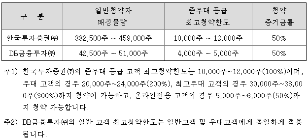 일반 청약자 배정 물량은 한국투자증권이 382,500주 ~ 459,000주이고, DB금융투자가 42,500주 ~ 51,000주입니다.