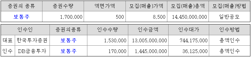 일반 청약자 배정 물량은 한국투자증권이 382,500주 ~ 459,000주이고, DB금융투자가 42,500주 ~ 51,000주입니다.