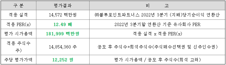 회사의 주당 평가가액은 2021년 순이익에 유사회사의 평균 PER배수를 적용하여 회사가치를 정하고, 주식수로 나누어 산출된 값과, 2022년 3분기말 순익익을 연간 환산한 후 유사회사의 평균 PER배수를 적용하여 회사 가치를 정하고 주식 수로 나누어 산출된 값의 편균치입니다.