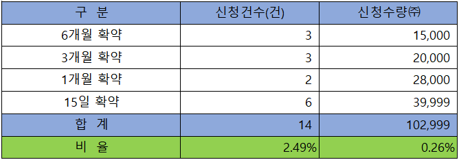 의무 보유 확약 건수는 14건에 102,999주로 전체 신청 물량 대비 건수로는 2.49%, 수량으로는 0.26%였는데 수량이 적어 의미가 없는 수치입니다.