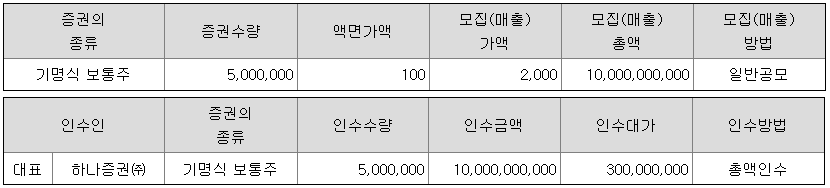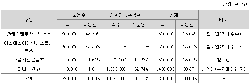 하나 27 호의 최대 주주는 (주)케이앤투자파트너스와 에스아이인베스트먼트(주)로 보통주 48.39%의 지분을 보유하고 있습니다. 또한 하나 27호 스팩은 전환사채 1,680백만원을 발행하였는데 하나증권이 주요 인수자입니다.