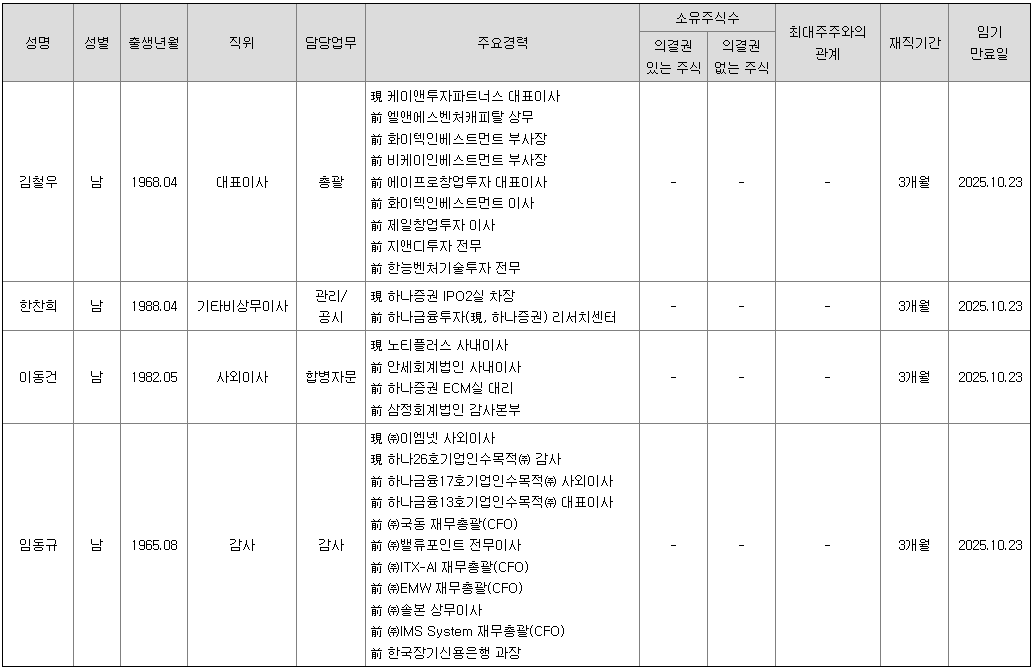 동사는 케인앤투자파트너스의 김철우대표이사가 대표이사를 맡고 있으며, 투자 업계 전문가들로 경영진을 구성하고 있습니다.