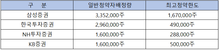 취급 증권사별 일반 청약자 배정 물량과 일반 청약자의 최고 청약 한도는 아래 표와 같습니다.