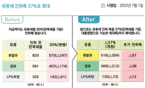 1. 유류세 인하폭 37%로 확대 (2022년 7월 1일~)