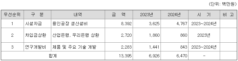 마이크로투나노는 금번 공모를 통해 조달된 자금으로 용인공장의 생산 설비에 84억을 사용하고, 연구개발비로 23억원을 사용한 후, 나머지 27억원으로 차입금을 상환하는 데 사용할 계획입니다.