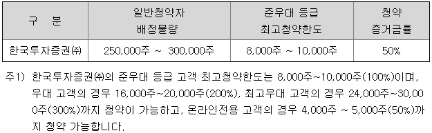 한국투자증권의 일반 청약자 배정 물량은 250,000주 ~ 300,000주이고, 일반 청약자의 최고 청약 한도는 온라인 전용 고객 기준 4,000주 ~ 5,000주입니다.