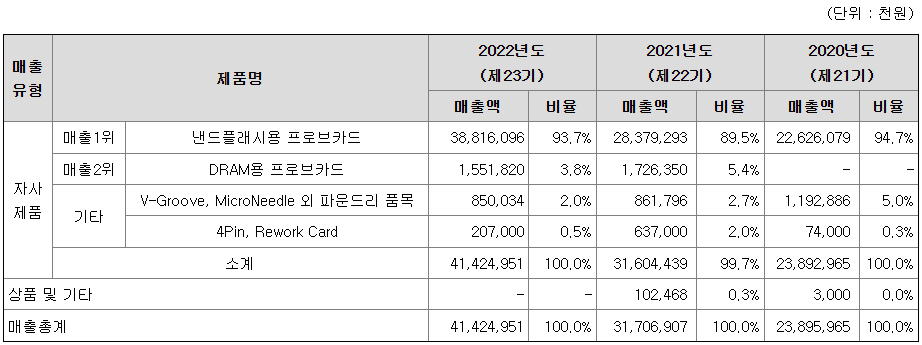 마이크로투나노의 매출액은 2020년 239억원에서 2021년 317억 2022년 414억원으로 계속 증가하고 있으며, 주력 제품인 낸드플래시용 프로브카드의 매출액이 절대적인 비중을 차지하고 있습니다.