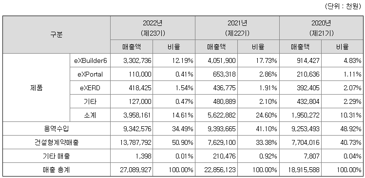 토마토시스템의 매출액은 2020년 189억원에서 2021년 228억원 2022년 271억원으로 지속 성장하고 있으며, 엑스빌더6의 매출 신장과 함께 솔류션을 포함한 용역 매출과 건설형 계약 매출도 증가하고 있습니다.
