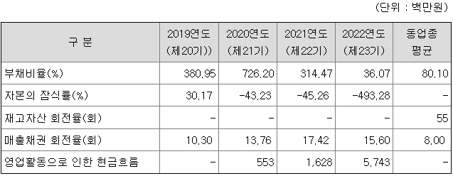 동사의 2021년도 말 부채비율은 업종 평균 대비 높은 편에 해당하지만, 이는 2021년 투자 유치한 상환전환우선주를 부채로 분류함에 기인한 것입니다.