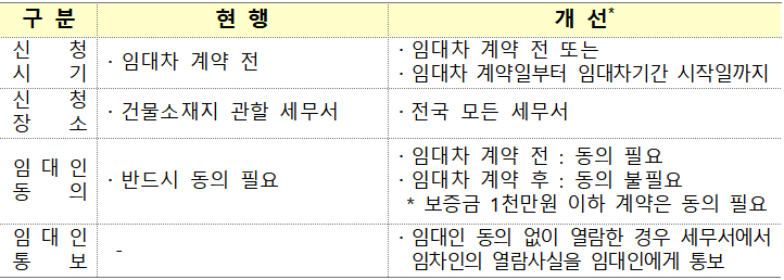 임대차 계약 전 또는 임대차 계약일부터 임대차 기간 시작일까지, 전국 모든 세무서에서 여람 신청 가능