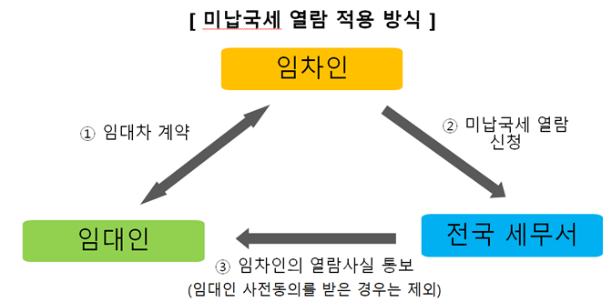 - 신청서 처리 부서(체납 징세과)에서는 관련 임대인의 미납국세 내역을 신청인이 열람할 수 있도록 하며, 임대인의 동의 없이 열람한 건은 임차인이 열람한 사실을 임대인에게 통보