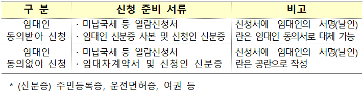 - 임차인은 임대차계약서등을 지참하여 가까운 세무서 민원봉사실을 방문하여 미납국세 열람 신청 가능