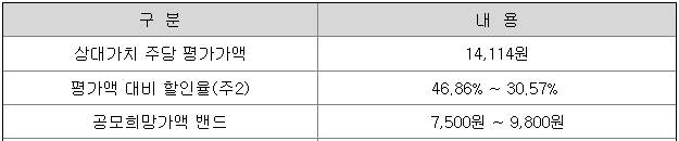 모니터랩의 희망 공모가격은 회사의 주당 평가가액 14,114원에서 30.57% ~ 46.86% 할인한 가격입니다.