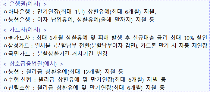 - 정책금융기관(산업은행,수출입은행,기업은행) 및 은행권, 상호금융권 등은 피해 기업과 소상공인의 기존 대출금에 대해 최대 1년간 만기 연장, 상환 유예 등 지원