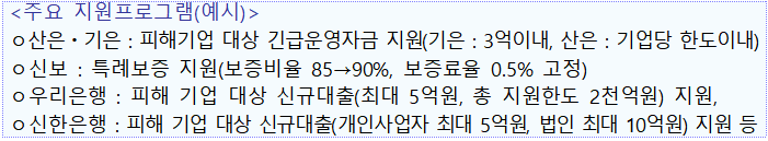- 정책금융기관(산업은행,기업은행) 및 은행권, 상호금융권 등은 피해 기업과 소상공인에 대해 복구 소요 자금 및 긴급 운영 자금 지원
