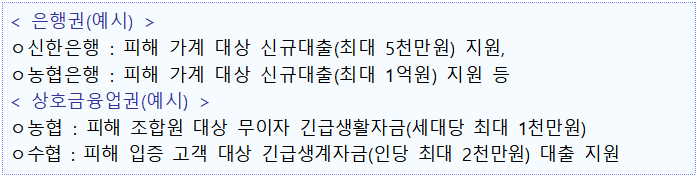 - 농협, 수협등 상호금융업권 : 피해 조합원 대상 무이자 긴급생활자금(세대당 최대 1천만원 등)