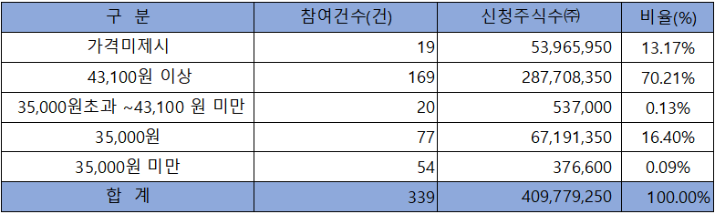 수요예측 신청 가격은 공모희망가격 상단 43,100원 이상 신청이 169건에 287백만주로 전체 신청의 70.21%를 차지했지만, 낮은 경쟁률을 고려해 공모희망가격 하단으로 결정된 것으로 보입니다.