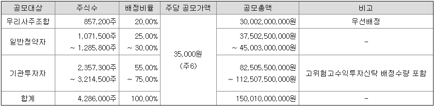 일반적으로 수요예측결과 1,000 : 1은 넘어야 어느정도 흥행이 되었다고 보는데, 겨우 100 : 1을 넘겨 고민스런운 결과입니다. 그렇다고 공모가격은 희망 공모가격 하단 이하로 낮추지도 않아서 상장 당일 가격이 걱정스러운 대목이라 하겠습니다.