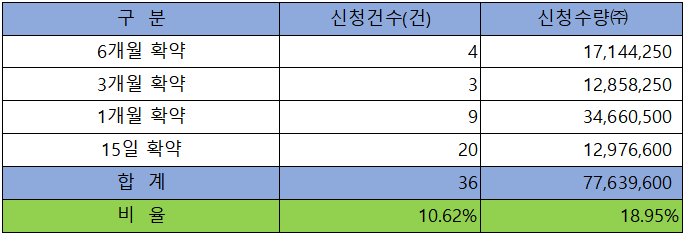 의무 보유 확약 건수는 36건에 77.6백만주로 전체 신청 물량 대비 건수로는 10.62%, 수량으로는 18.95%%였습니다.