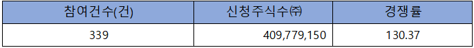 수요예측 참여 건수는 총 339건에 신청 주식수 409백만주로 경쟁률 130.37 : 1의 실적을 기록했습니다.