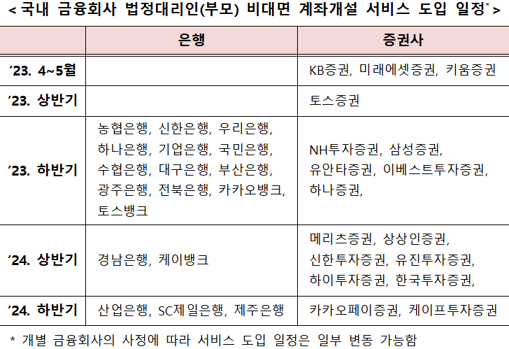 또한, 법정대리인인 부모를 통한 비대면 계좌개설 서비스의 구체적인 도입 일정 등은 각 금융회사가 자율적으로 결정할 예정입니다.