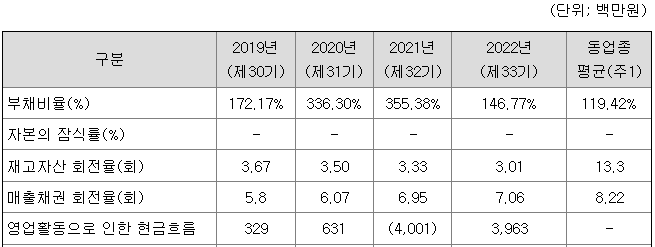동사의 부채 비율은 2020년과 2021년에 높은 편이었으나 이는 상환전환우선주의 부채 계상과 와인 포트폴리오 확충을 위한 재고 증대에 기인합니다. 2022년 상반기에 상환전환우선주가 보통주로 전환됨에 따라 부채비율이 개선되었습니다.