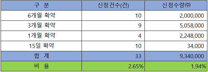 의무 보유 확약 건수는 33건에 9,340,000주로 전체 신청 물량 대비 건수로는 2.65%, 수량으로는 1.94%였으며, 특히 3개월 이상 확약 건수가 19건에 달해 보통 수준의 참여 경쟁률치고는 높은 수치를 나타냈습니다.