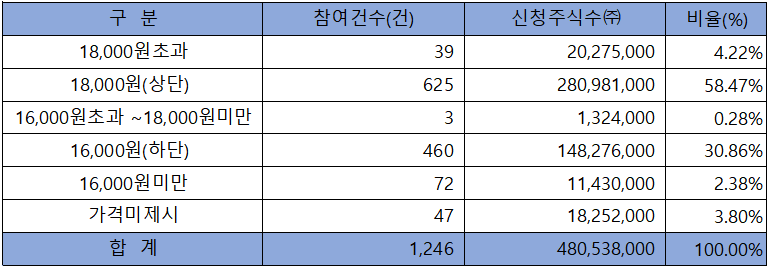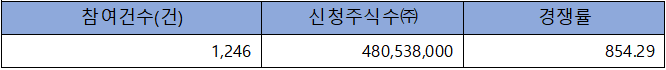 수요예측 참여 건수는 총 1,246건에 신청 주식수 480,538,000주로 경쟁률 854.29 : 1의 보통 수준 실적을 기록했습니다.