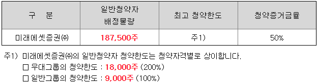 미래에셋증권의 일반 청약자 배정 물량은 187,500주이고, 일반 청약자의 최고 청약 한도는 일반 그룹 기준 9,000주입니다.