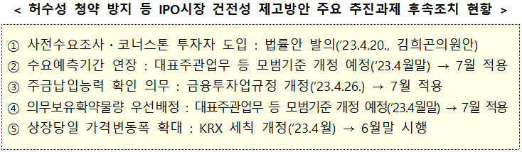 금융위원회에서는 IPO시장 건전성 제고를 위한 주요 추진 과제들을 4월까지 대부분 마무리되고, 하반기에 본격적으로 시행되면, IPO시장이 보다 공정하고 건전하게 발전할 수 있을 것으로 기대된다고 밝혔습니다.