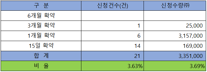 의무 보유 확약 건수는 21건에 3,351,000주로 전체 신청 물량 대비 건수로는 3.63%, 수량으로는 3.69%였습니다.