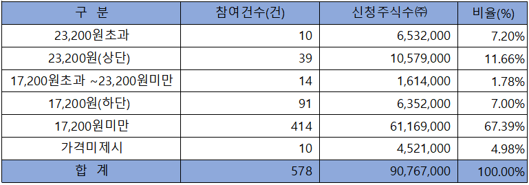 수요예측 참여 건수는 총 578건에 신청 주식수 90,767,000주로 경쟁률 86.44 :1의 매우 저조한 실적을 기록했습니다.