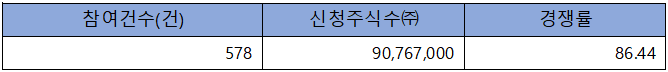 수요예측 참여 건수는 총 578건에 신청 주식수 90,767,000주로 경쟁률 86.44 :1의 매우 저조한 실적을 기록했습니다.