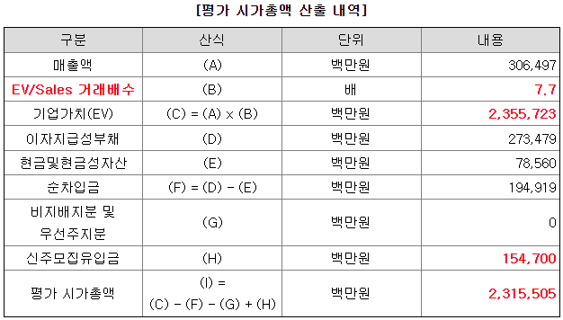 회사의 주당 평가가액은 2022년 1분기 기준 직전 12개월의 매출액 3,065억원에 유사회사의 평균 EV/SALES 멀티플 7.7배를 적용하여 산출한 평가 시가 총액 약 2조 3천억원을 주식수로 나누어 산출했습니다.