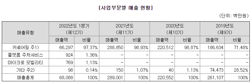 카셰어링 사업의 점유율이 절대적 비중을 차지하고 있습니다.