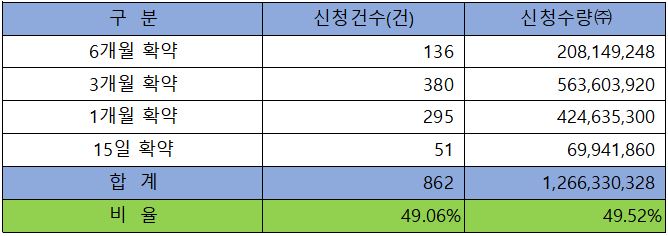 의무 보유 확약 건수는 862건에 1,266,330,328주로 전체 신청 물량 대비 건수로는 49.06%, 수량으로는 49.52%로 매우 높은 의무 보유 확약 신청 내용이었습니다.