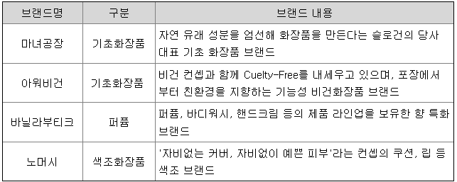 마녀공장은 아래와 같이 2개의 기초화장품 브랜드와 향 특화 브랜드 및 색조 화장품 브랜드를 각 1개씩 보유하고 있으며 브랜드별 특징은 아래 표와 같습니다.