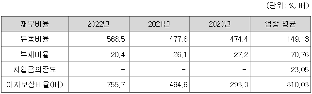 동사는 재무 안전성 측면에서도 동업종 평균 대비 높은 유동비율과 낮은 부채비율을 보이고 있습니다.