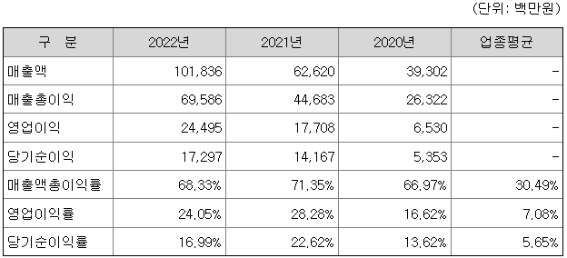 마녀공장은 지속적인 매출 성장과 함께 업종 평균 대비 높은 영업이익률과 당기 순이익률을 기록하고 있습니다.