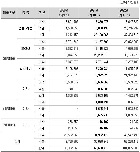 마녀공장의 매출액은 2020년 393억에서 2021년 626억, 2022년에1,018억으로 급격한 매출 신장세를 보이고 있으며, 특히 2022년의 경우 전체 매출액에서 55.3%에 해당하는 563억원의 수출 실적을 기록하였습니다.