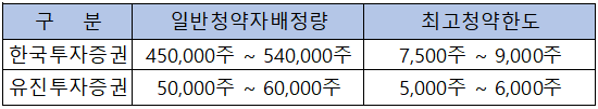 증권사별 일반 청약자 배정 물량과 일반 청약자의 최고 청약 한도는 아래 표와 같습니다.