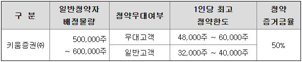 키움증권의 일반 청약자 배정 물량은 500,000주 ~ 600,000주이고, 일반 청약자의 최고 청약 한도는 일반 고객 기준 32,000주 ~ 40,000주입니다.