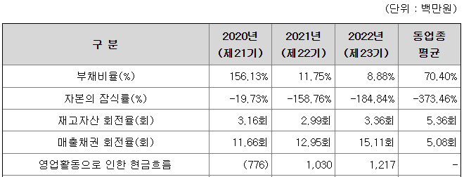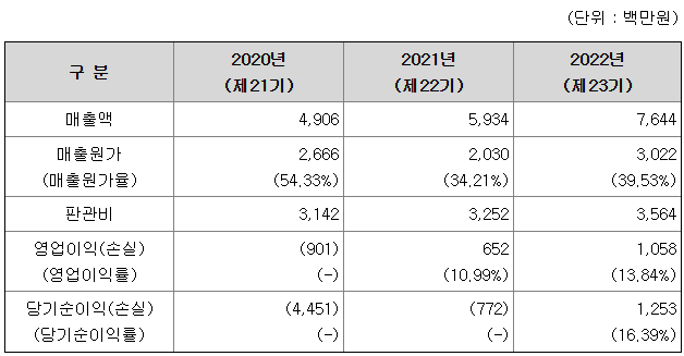 또한 매출 실적 상승에 따라 2021년부터 영업이익을 시현하고 있으며, 2022년부터는 당기 순이익을 시현하고 있습니다.