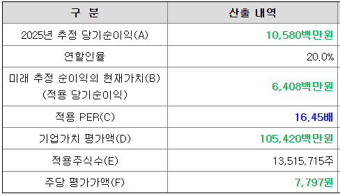 회사의 주당 평가가격은 2025년 추정 순이익을 현재 가치로 할인 환산한 후 유사회사의 평균 PER배수를 곱하여 회사 가치를 정하고 주식 수로 나누어 산출한 것입니다.