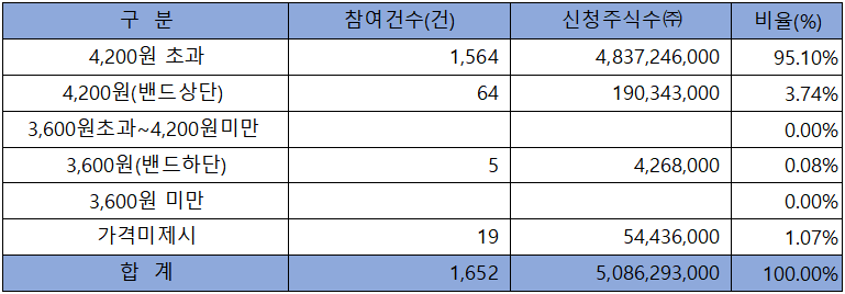 수요예측 참여 건수는 총 1,652건에 신청 주식수 5,086,293,000주로 참여 경쟁률 1,595.70 : 1의 매우 좋은 실적을 기록했습니다.