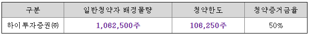 하이투자증권의 일반 청약자 배정 수량은 1,062,500주이고, 일반 청약자의 최고 청약 한도는 모든 고객 동일하게 106,250주입니다.
