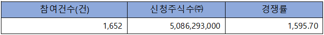 수요예측 참여 건수는 총 1,652건에 신청 주식수 5,086,293,000주로 참여 경쟁률 1,595.70 : 1의 매우 좋은 실적을 기록했습니다.