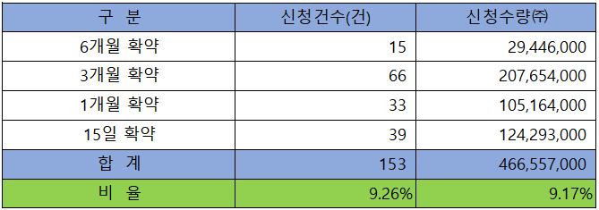 의무 보유 확약 건수는 153건에 466,557,000주로 전체 신청 물량 대비 건수로는 9.26%, 수량으로는 9.17%였으며 15일부터 6개월 보유까지 다양한 분포를 보였습니다.